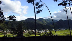 ![]() 露天風呂から見た武石村ののどかな風景 四角い田んぼが並んでいる ところが印象的だった。 この右手の方向が美ケ原となる。 |